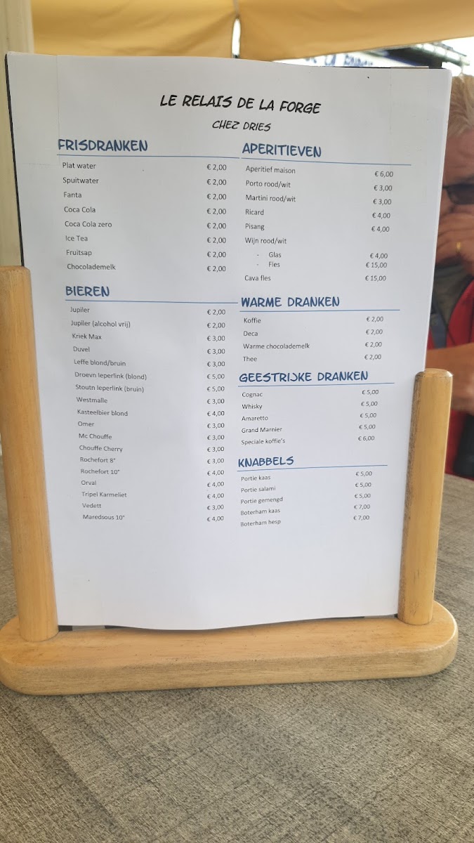 The menu at Le Relais de la Forge chez Dries offers a selection of beverages and light food options suitable for casual and quick dining. Visitors can find a variety of hot and cold drinks, including coffee and beer. The food offerings focus on small meals and snacks, designed to complement refreshments, making it an appropriate choice for coffee breaks or light meals during outings.